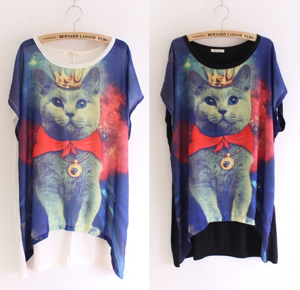 Unisex women Galaxy Bow cat space print graphic T-shirt long rock punk tops